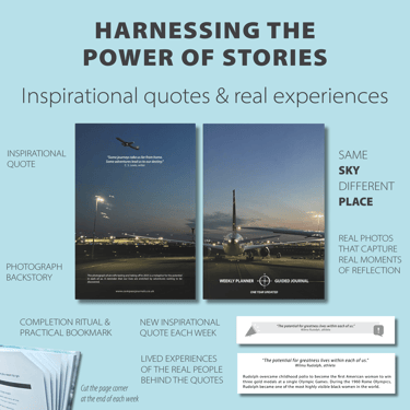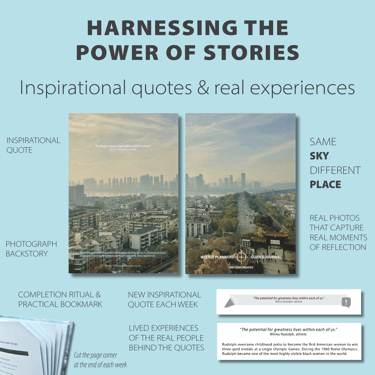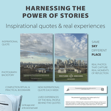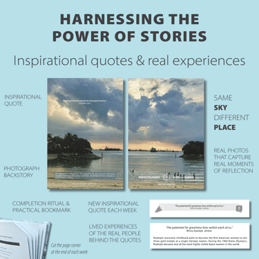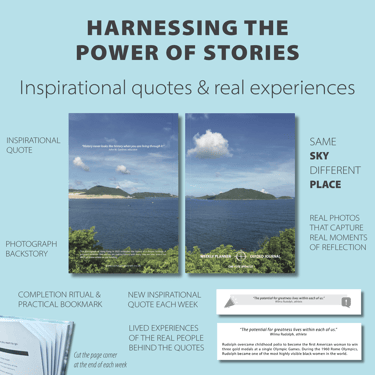 Inspirational quotes + stories – quotes are thoughtfully placed in context alongside compelling backstories to increase motivation.